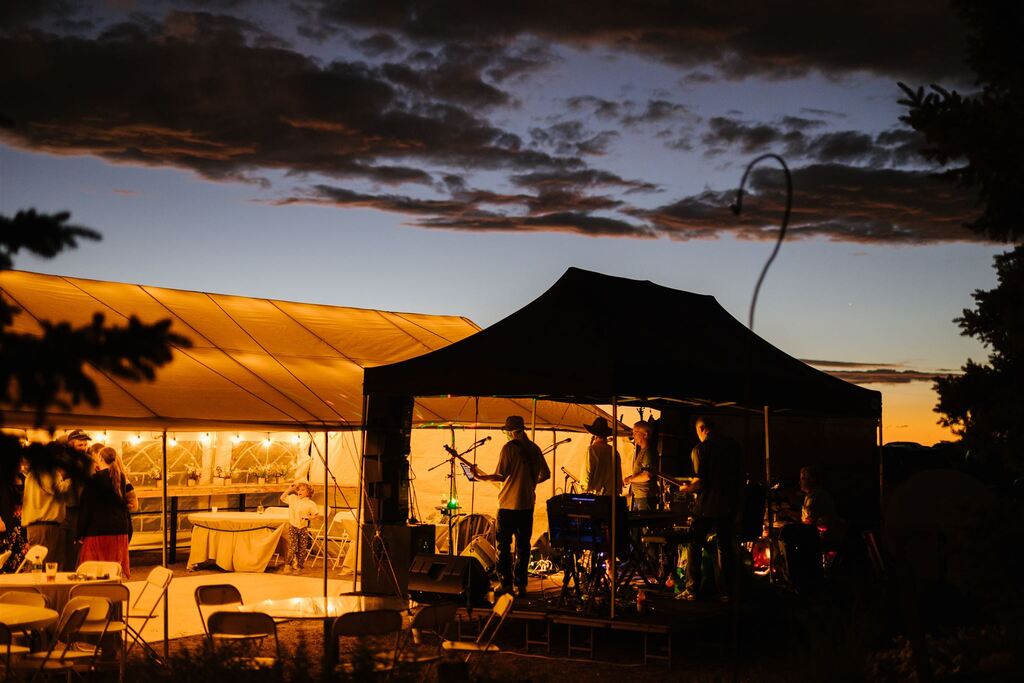-The venue, which has mountain views, includes an outdoor kitchen with sink, barbecue, refrigerator, and a shade covered table that seats 20. The entire venue on ten acres has great outdoor lighting for late-night partying.